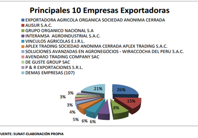 En el siguiente cuadro podemos obervar que Exportadora Agricola Organica es la principal exportadora de granos andinos en el Peru con una participacion del 25.6% del total exportaciones y con envios superiores a 20 millones de dolares en el periodo 2013, principalmente a los mercados de Estado Unidos y Australia.
